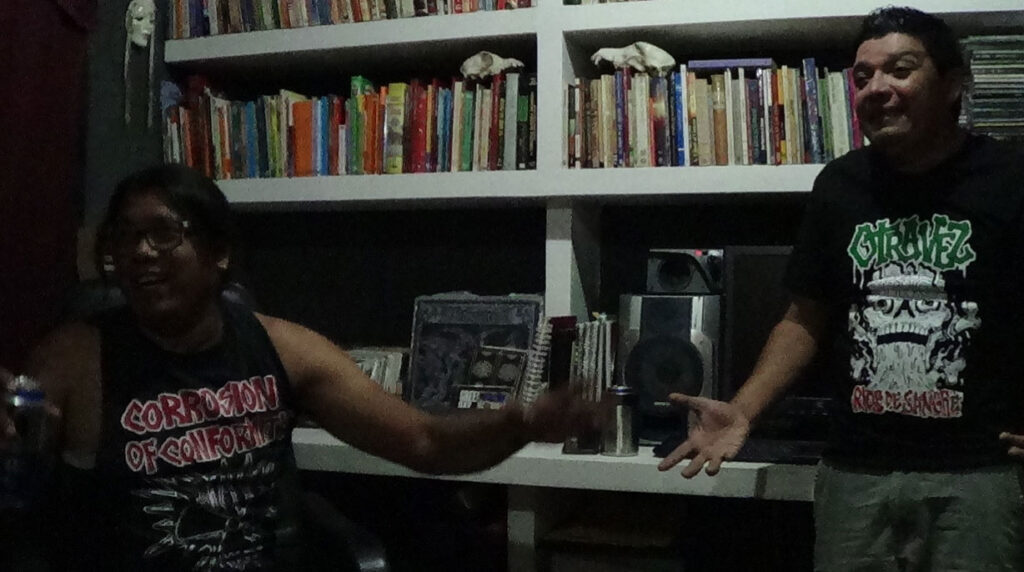 Miguel: En Los Naranjos conocí al Fernando, que después sería el vocalista de Víctimas. Banda que en un principio tocaba hardcore y se llamaba Víctimas de destrucción. Él era más grande que yo. Cuando iba a su casa se percibía mucha cultura. Sus tíos eran pintores, poetas, músicos. Bien chamaquito veía cine con él. Recuerdo que una vez puso La naranja mecánica, todavía en formato beta. Yo estaba bien morrito y eso te marca. Por ahí también conocí al Asdrúbal, que antes de Víctimas tenía una banda punkosa que era muy conocida entonces: Putrefacción Juvenil. Había bandas en la escena también como Democracia Real y claro, Suciedad Discriminada.
